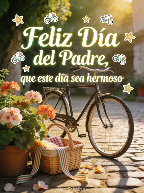 Compartan imágenes gratis del Día del Padre con elegante letra crema, stickers de bicicletas pequeñas y estrellas, una bicicleta vintage junto a un geranio en flor, cesta de picnic, cinta a rayas y adoquines iluminados por el sol. También pueden descubrir feliz domingo día del padre, una tarjeta original del Día del Padre o feliz día del padre papá.