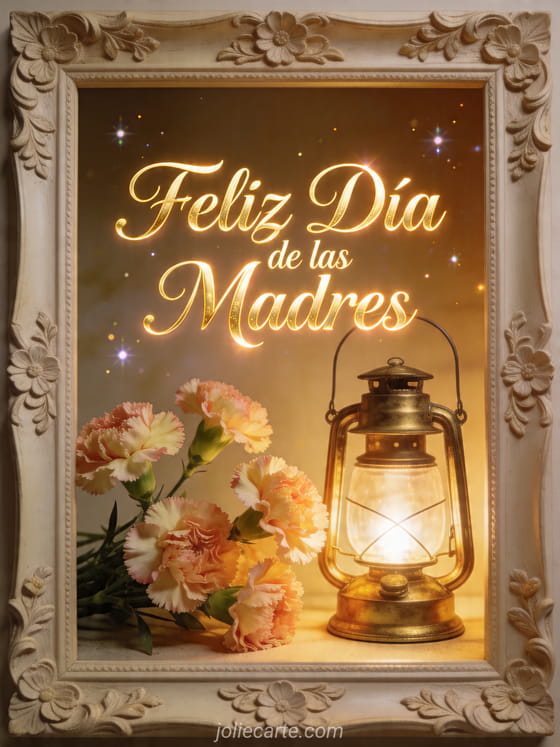 Envía imágenes gratis Día de las Madres con caligrafía champán, brillo cálido y una linterna de latón fotorrealista junto a claveles frescos dentro de una moldura decorativa. La luz dorada y los pequeños destellos hacen que esta tarjeta sea acogedora y festiva. Descubre también imágenes para el Día de la Madre, foto para el Día de las Madres o poemas del Día de las Madres.