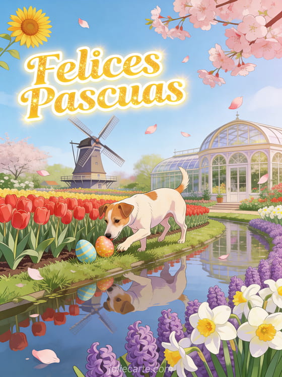Celebra la Pascua con esta encantadora tarjeta animada gratuita con un Jack Russell Terrier olfateando huevos de Pascua pintados entre tulipanes rojos en Keukenhof con un molino holandés reflejado en un canal, jacintos y cerezos en flor. Descubre también carte virtuelle gratuite paques cartes de pâques gratuites pour facebook.