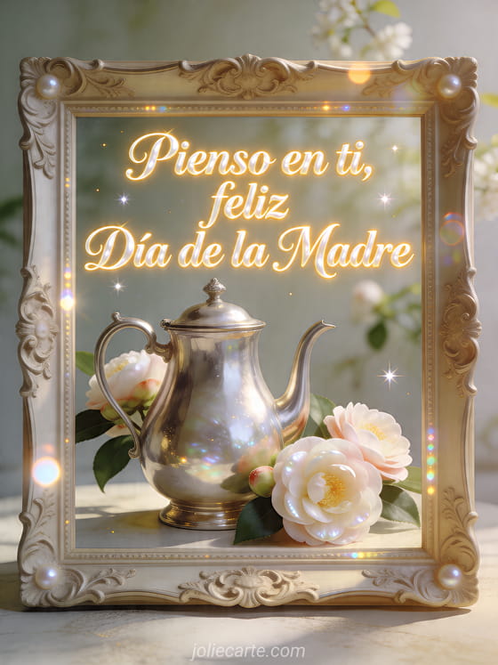 Compartan una tarjeta sentida del Día de la Madre con una tetera plateada, camelias frescas, detalles ornamentados y reflejos luminosos de primavera. Descubran también una foto para el Día de las Madres, poemas del Día de las Madres o imágenes feliz Día de las Madres.