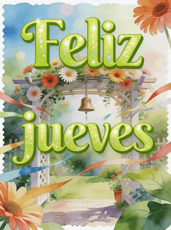 Envíen imágenes para feliz jueves con letras verde lima, una pérgola de jardín, gerberas, un carillón de bronce y cintas coloridas moviéndose con la brisa. Descubran también un feliz jueves poema, feliz jueves bendición o un buen día de jueves gif.