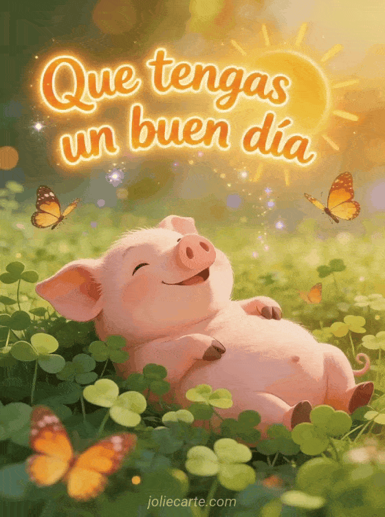 Comparte jueves buen día con un cerdo contento descansando feliz en un campo de trébol mientras vuelan mariposas. Envía más deseos luminosos con bella imagen para decir feliz jueves, feliz jueves cita imágenes o buen día de jueves.