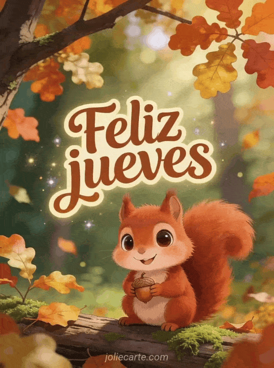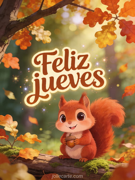 Envía un saludo de feliz jueves lleno de humor con esta adorable tarjeta de ardilla y encanto otoñal. Descubre también feliz jueves soleado imagen, buen día jueves divertido o gif buenos días es jueves.