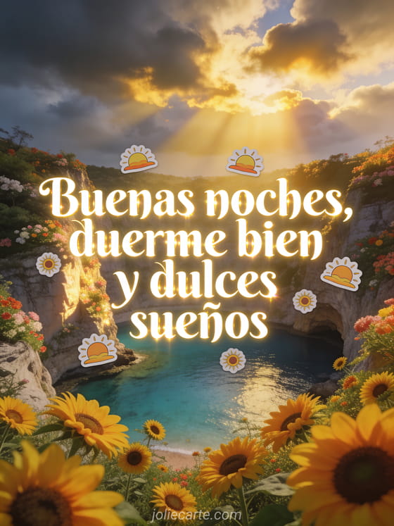 Comparte una cálida buenas noches con esta linda tarjeta con girasoles en primer plano frente a una bahía secreta rodeada de acantilados floridos con rayos de luz dorada entre nubes dramáticas. Descubre también una linda tarjeta de buenas noches, un mensaje de buenas noches gracioso o fotos de buenas noches.