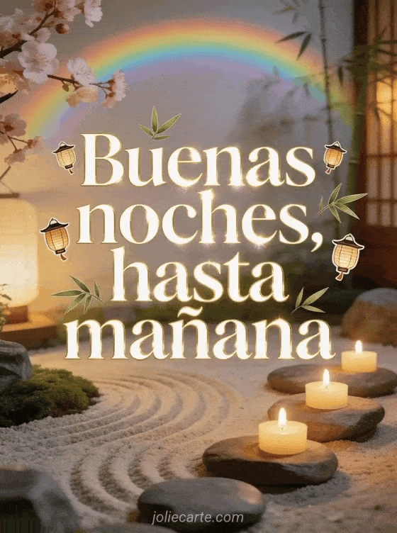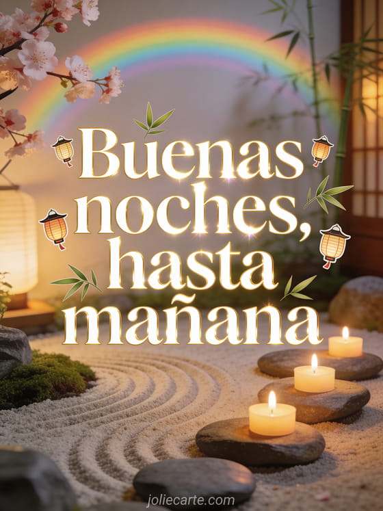 Comparte una tranquila buenas noches con esta linda tarjeta con un jardín zen con arena rastrillada y piedras, faroles japoneses, velas encendidas, flores de cerezo y un arcoíris en cálida luz relajante. Descubre también un mensaje de buenas noches gracioso, fotos de buenas noches o un pensamiento de buenas noches.