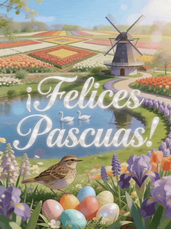 Comparte una hermosa tarjeta de Felices Pascuas con un pipit saltando entre huevos coloridos en un jardín de tulipanes. Descubre también una tarjeta de Pascua gratis o un Felices Pascuas gif.