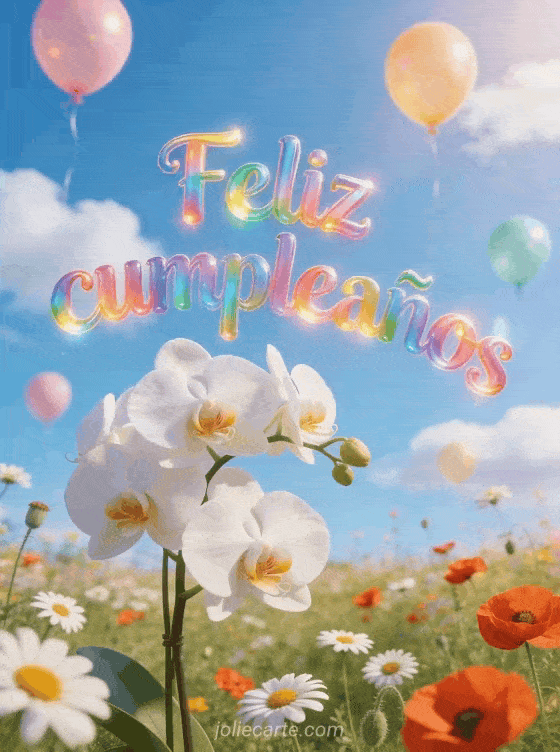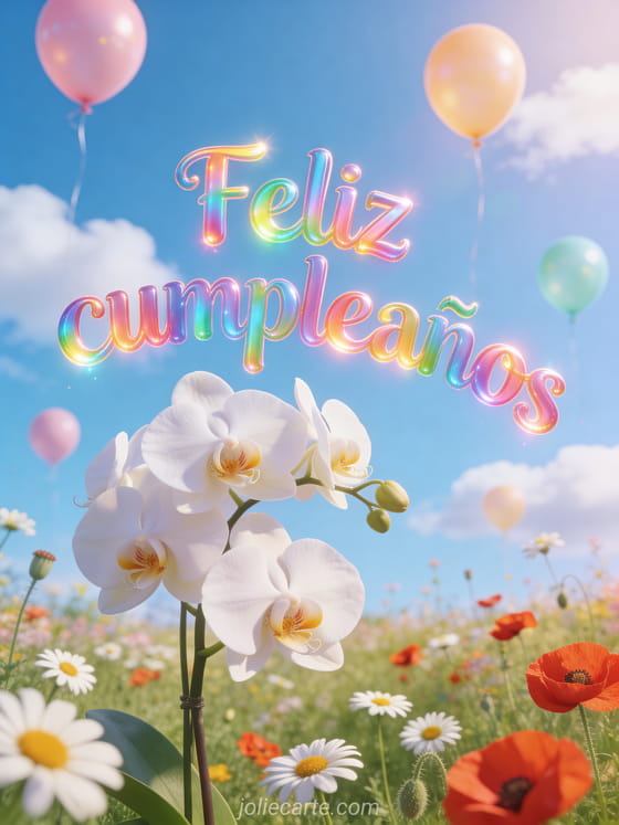 Celebren con una linda tarjeta virtual cumpleaños niño con orquídeas blancas en un prado florido de margaritas y amapolas, globos elevándose al cielo azul y luz cálida de primavera. También pueden descubrir ciber tarjetas cumpleaños niño, tarjeta cumpleaños niño gratis y pancarta feliz cumpleaños bebé.