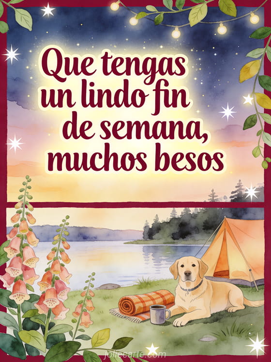 Comparte cariño de fin de semana con un perro labrador junto a una tienda al lago, una taza de camping, una manta enrollada y flores digitales. También puedes enviar besos fin de semana, besos de fin de semana o una feliz fin de semana besotes imagen.