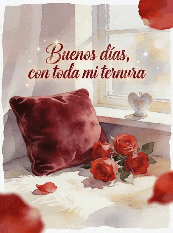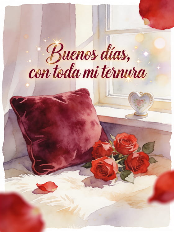 Envía una tarjeta tierna de buenos días con letras rubí en acuarela, un cojín de terciopelo, rosas rojas y un pequeño adorno de corazón de porcelana en un rincón luminoso junto a la ventana. Descubre también una mensaje de buenos días para ella, una mensaje de buenos días para una amiga o una tarjeta floral de buenos días.