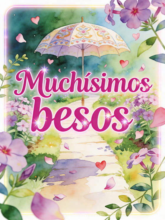 Envía muchísimos besos con un camino de jardín bajo un paraguas decorativo, pétalos en forma de corazón y flores de phlox brillantes. Descubre también te mando muchos besos gif, mandar besos gif o besos de animales gif.