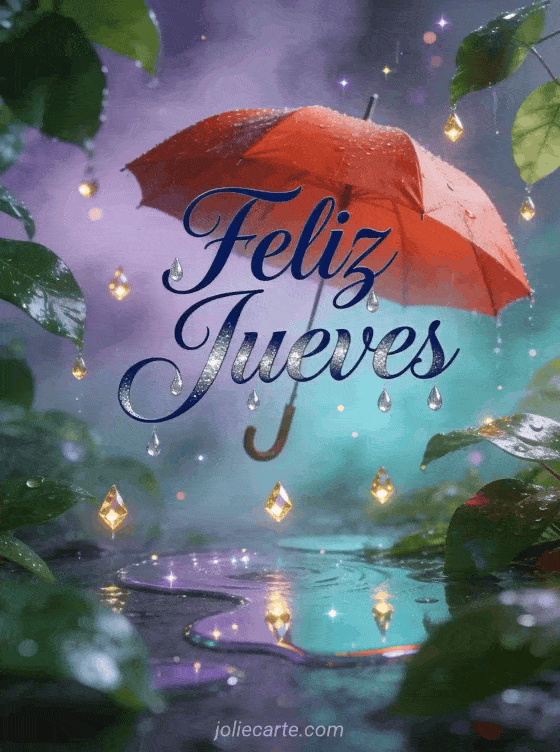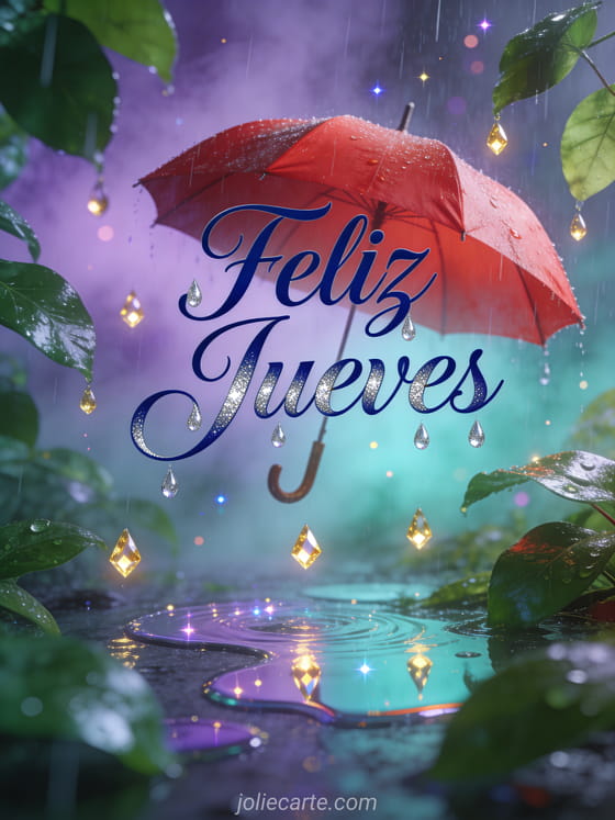 Comparte un cálido deseo de feliz jueves con esta mágica tarjeta con un paraguas rojo entre gotas de lluvia brillantes. Descubre también feliz jueves besos o imagen feliz jueves zen para más inspiración del jueves.
