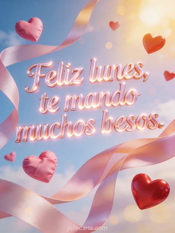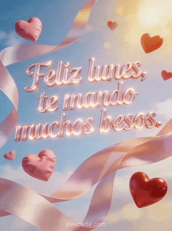 Comparte lunes besos con letras románticas brillantes, corazones flotantes y cintas satinadas en un cielo luminoso con bokeh suave. También pueden enviar feliz lunes tarjetas, una feliz lunes tarjeta virtual gratis o gif feliz lunes buena semana.