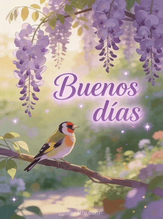 Mañana buenos días un sereno y apacible saludo matutino con un colorido jilguero entre flores de glicina cascante