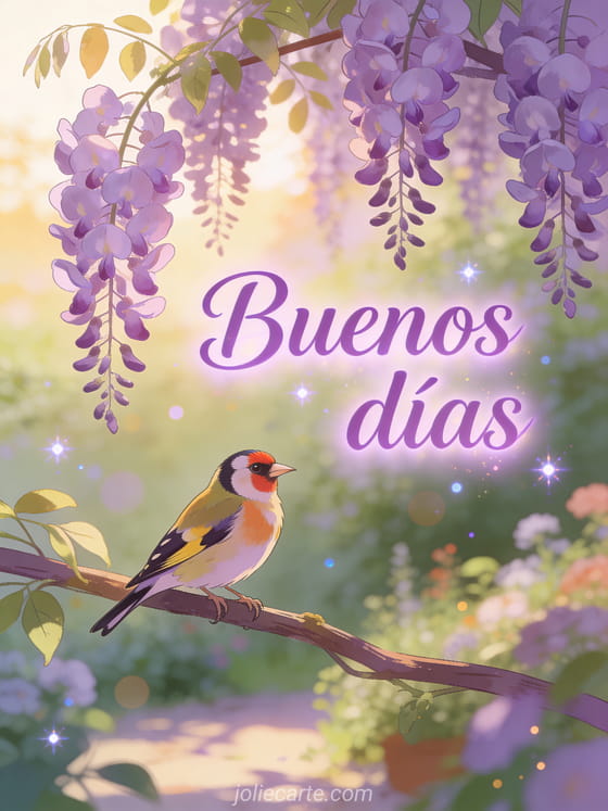Comparte un hermoso saludo de amanecer con un jilguero posado en una glicina en flor. Descubre también un mensaje buenos días mi querida o una buenos días soleado tarjeta.