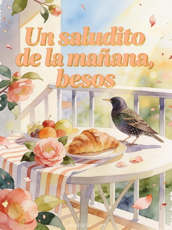 Comparte un saludito luminoso de mañana con esta tarjeta en acuarela, con un estornino junto a un croissant hojaldrado, camelias, fruta fresca, tela rayada y sol de balcón. Descubre también mensaje un saludito besos, hola besos buen despertar gifs animados o hola violeta.
