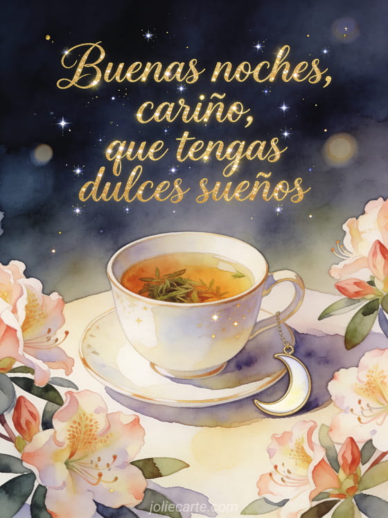 Compartan un mensaje cálido de buenas noches cariño con una taza de porcelana con tisana, un adorno de luna creciente y flores de rododendro en acuarela. Descubran también mensaje de deseo de buenas noches, buena noche buenas noches tarjeta o tarjeta online buenas noches.