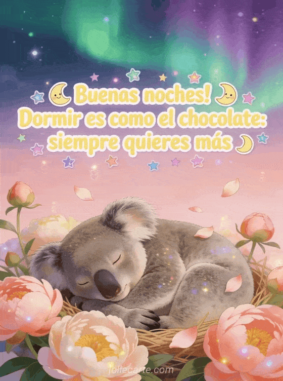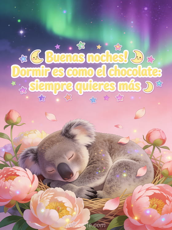 Comparte una risa antes de dormir con esta graciosa tarjeta con un koala dormido entre peonías bajo un cielo de aurora boreal rosa y verde con un ingenioso mensaje sobre el sueño y el chocolate. Descubre también fotos de buenas noches, un pensamiento de buenas noches o un mensaje de buenas noches tierno.