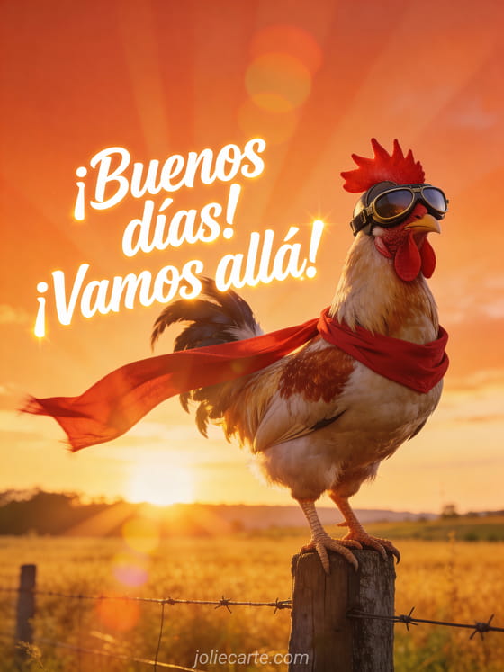 Comienza el día con este gracioso mensaje de buenos días romántico con un gallo orgulloso en gafas de aviador. Mira también gifs animados buenos días graciosos o imagen buenos días humor.
