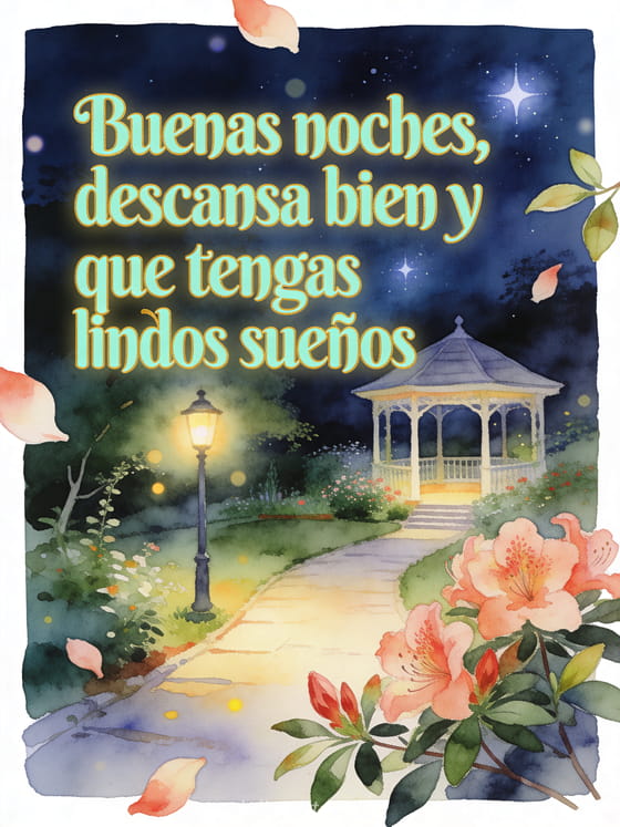 Comparte un saludo suave de buenas noches con un sendero de jardín iluminado por linternas, estrellas brillantes y flores de azalea. Para más deseos nocturnos, descubre un hermoso mensaje de buenas noches, una linda tarjeta buenas noches besos o un lindo mensaje de buenas noches.