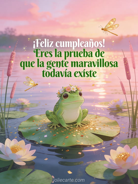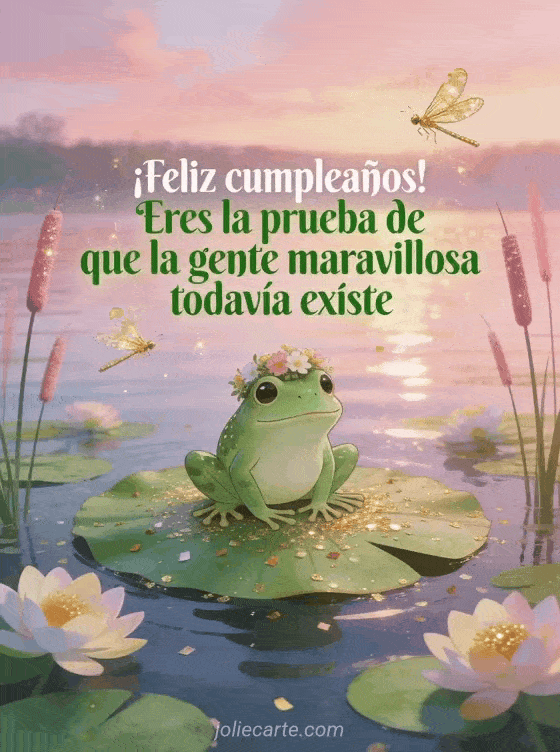 Comparte un mensaje de cumpleaños gracioso con una rana encantadora sobre un nenúfar gigante, libélulas brillantes y atmósfera de estanque soñador. Descubre también hombre gif cumpleaños humor, feliz cumpleaños gracioso y cumpleaños gato humor.