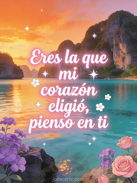 Dile que piensas en ella con esta tierna tarjeta romántica con el lagon de El Nido en Palawan al atardecer con digitales violetas y estrellas nacientes. Descubre también una tarjeta pienso muy fuerte en ti o una tarjeta besos pienso en ti.