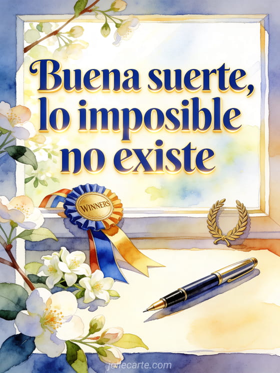 Envía una tarjeta confiada de buena suerte con una cinta de ganador, un bolígrafo pulido, un amuleto de laurel y flores de jazmín bajo una luz brillante de ventana. También puedes enviar una imagen mucha suerte con un caballo, un buena suerte ánimo gif o una tarjeta de buena suerte gratis.