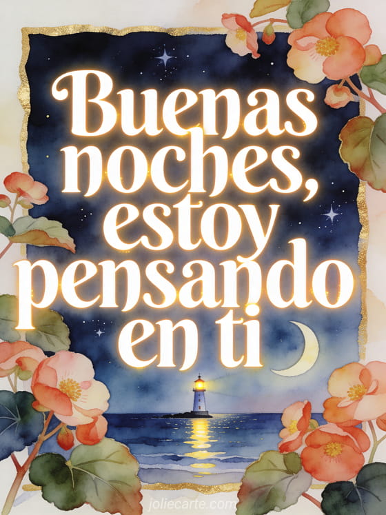 Comparte un mensaje suave de buenas noches con un faro luminoso, un mar nocturno tranquilo, una luna creciente y begonias. También puedes enviar un mensaje para desear buenas noches, un buenas noches mensaje o un mensaje corto para decir buenas noches.