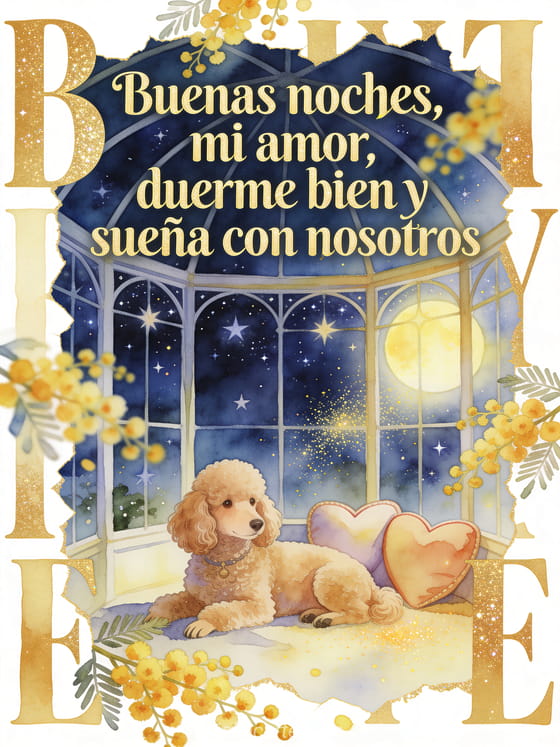 Envía un mensaje de buenas noches para su hombre con letras doradas en acuarela, un caniche junto a cojines con forma de corazón y racimos de mimosa brillando en un invernadero estrellado. También pueden gustarte esta tarjeta de mensaje dulce de buenas noches, esta tarjeta de mensaje de buenas noches para su novia o esta tarjeta de precioso mensaje de buenas noches.