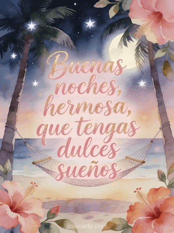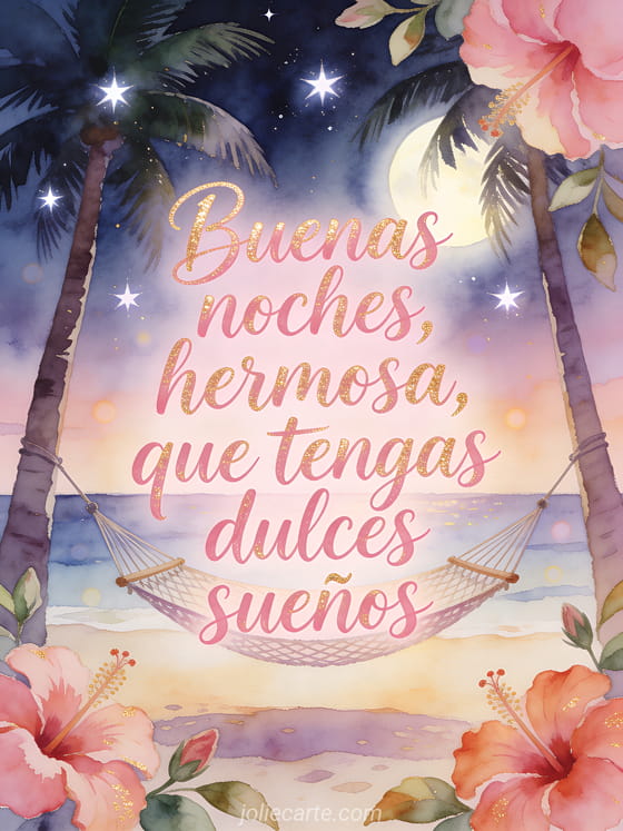 Comparte una noche tropical suave en acuarela con una hamaca iluminada por la luna entre palmeras, estrellas brillantes, flores de hibisco y un cálido brillo isleño. Descubre también precioso mensaje de buenas noches, mensaje de buenas noches para ella o mensaje para decir buenas noches a tu amor.