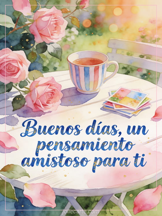 Envía un mensaje cálido de buenos días a un amigo con letras cobalto en acuarela, rosas rosadas, una taza rayada y postales coloridas sobre una mesa de jardín acogedora. Descubran también mensaje de buenos días para la mañana, tarjetas animadas de buenos días o tarjeta virtual de buenos días para ti.