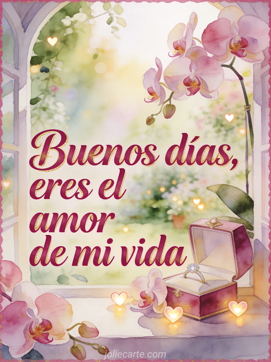 Envíe un mensaje de buenos días conmovedor para mi esposa con una escena luminosa en acuarela, orquídeas, un joyero y pequeños corazones brillantes. Comparta este saludo tierno para empezar su día con amor, y descubran también un mensaje de buenos días para su hombre, un mensaje de buenos días amistoso o un mensaje lindo de buenos días.