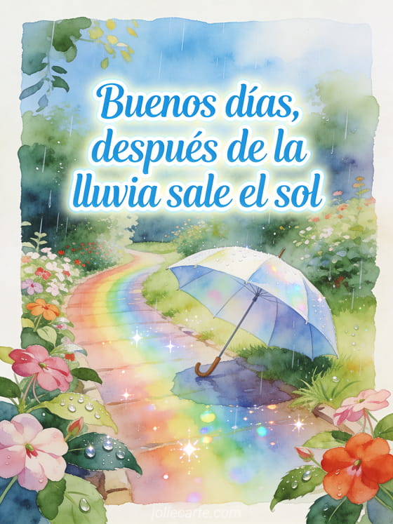 EnvĂa un mensaje de buenos dĂas conmovedor con letras azul cielo esperanzadoras en acuarela, un paraguas brillante, un camino de jardĂn iluminado por arcoĂris, impatiens y gotas de lluvia relucientes. Descubran tambiĂ©n mensaje de buenos dĂas matutino, tarjeta virtual animada de buenos dĂas o un mensaje de buenos dĂas para mi novia.