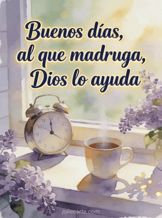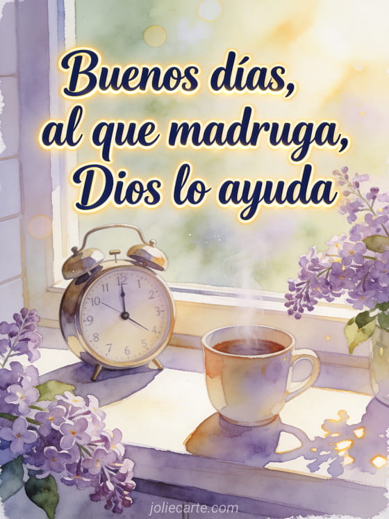 Envía un mensaje de buenos días matutino con letras azul marino nítidas en acuarela, una ventana alegre de cocina, un despertador vintage, una taza humeante y ramas frescas de lila. Descubran también tarjeta virtual animada de buenos días, un mensaje de buenos días para mi novia o tarjetas de buenos días gratis.