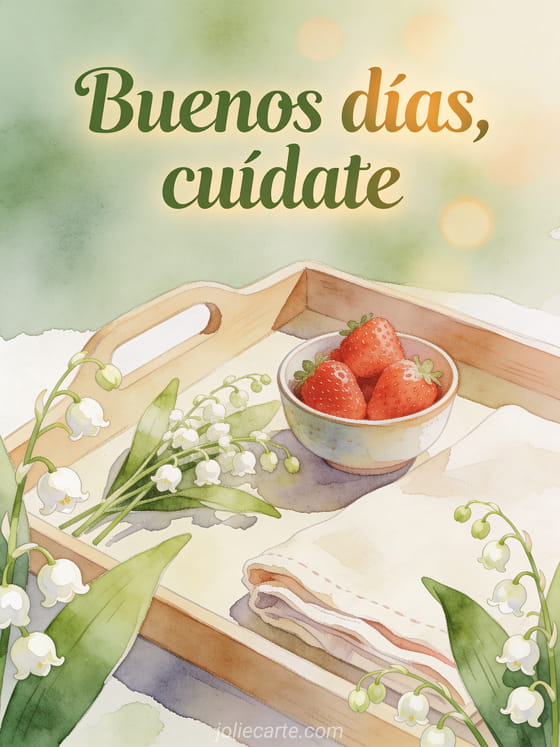Envíe un mensaje de buenos días para él con una bandeja de desayuno en acuarela, lirios de los valles, fresas y lino doblado. Esta tarjeta tierna es ideal para decir cuídate con una calma luminosa de la mañana, y también pueden descubrir un mensaje buenos días madrugador, un buenos días a su enamorado o un mensaje buenos días a mi amor.