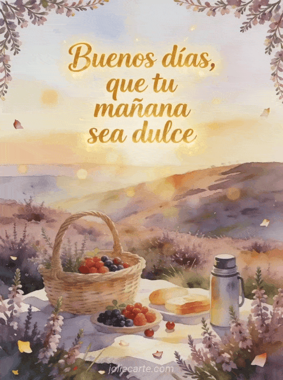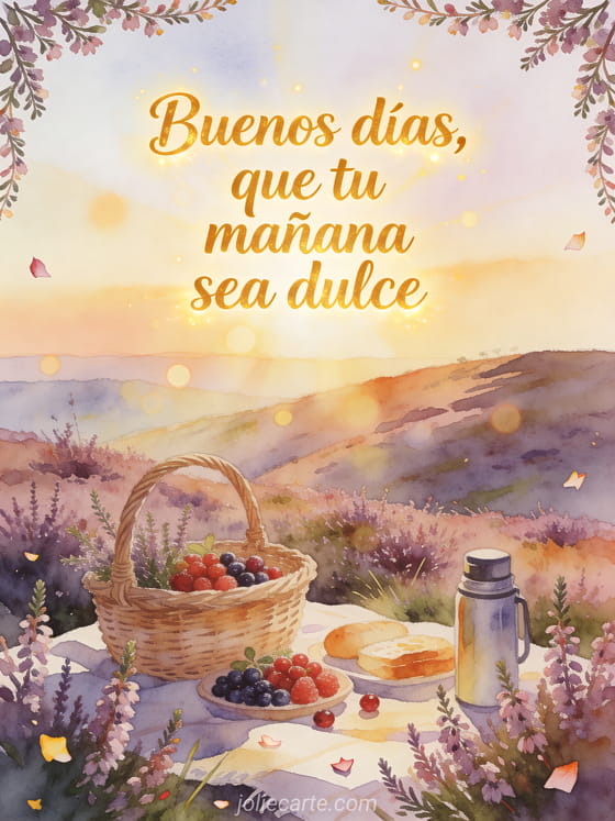 Envía un mensaje relajante de buenos días para la mañana con letras doradas como miel en acuarela, una colina cubierta de brezo, una cesta de mimbre, bayas y un pequeño termo. Descubran también tarjetas animadas de buenos días, tarjeta virtual de buenos días para ti o mensaje de buenos días de mañana para persona especial.