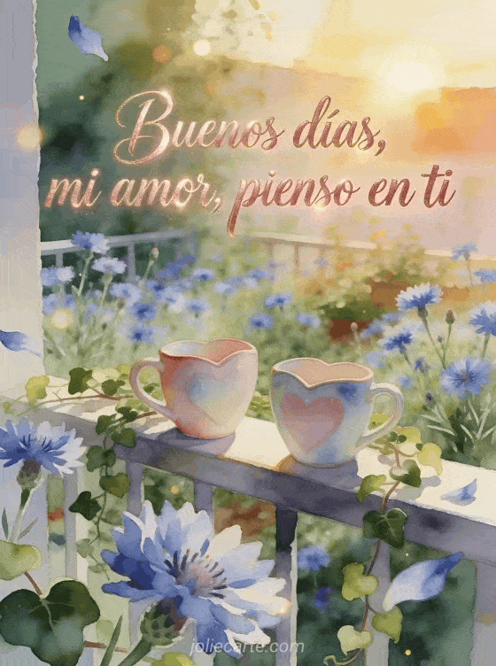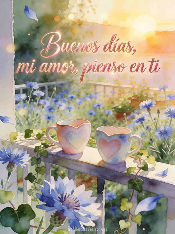 Envía una tarjeta tierna de buenos días con letras rosa dorado en acuarela, un jardín de balcón al amanecer, acianos, hiedra y dos tazas de cerámica en forma de corazón. Descubre también una tarjeta virtual de buenos días, una mensaje de buenos días a un amigo o una mensaje de buenos días para la mañana.