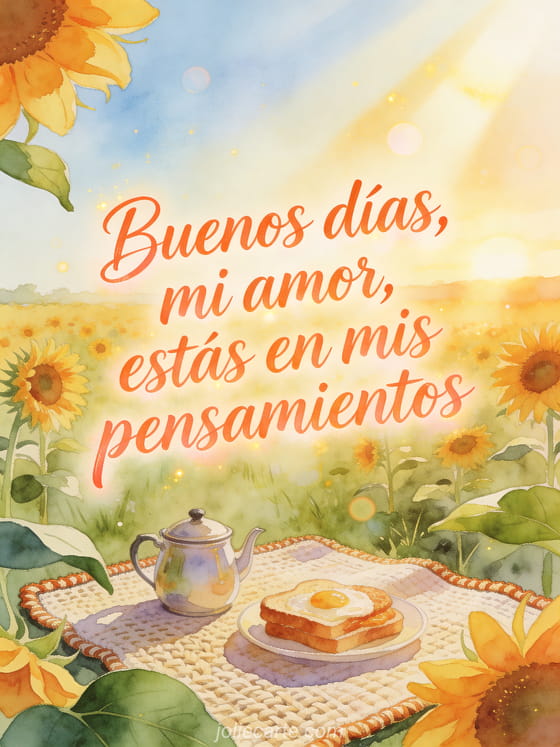 Envía un mensaje de buenos días para su esposa con una tarjeta brillante, llena de calidez de amanecer, girasoles y ternura afectuosa. También pueden compartir un hola cómo estás, una tarjeta virtual buenos días o un buenos días cómo estás.
