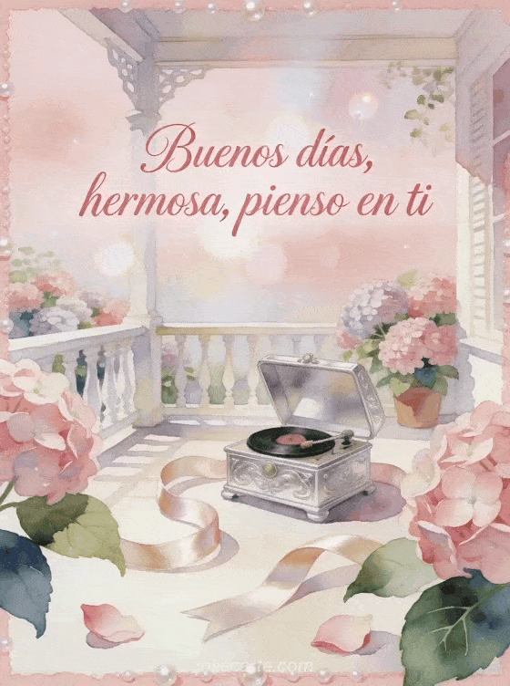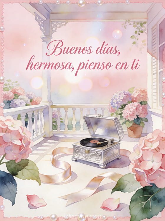 Envía una tarjeta romántica con una galería luminosa, racimos de hortensias, una caja de música plateada y cintas de satén en luz matinal suave. Descubran también un ejemplo de mensaje de buenos días, un mensaje de buenos días conmovedor o un mensaje de buenos días matutino.