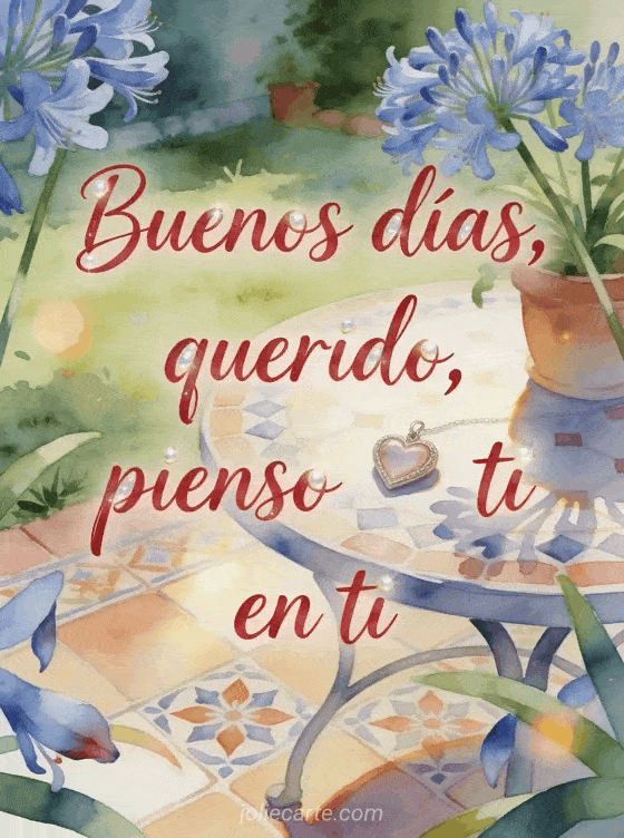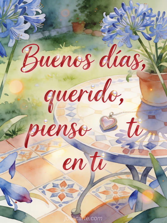 Envía una tarjeta romántica de buenos días con escritura carmesí tierna en acuarela, una mesa acogedora de jardín, agapantos azules, un pequeño medallón en forma de corazón y azulejos estampados. Descubre también una mensaje de buenos días para mi hombre, una tarjeta virtual de buenos días o una mensaje de buenos días a un amigo.