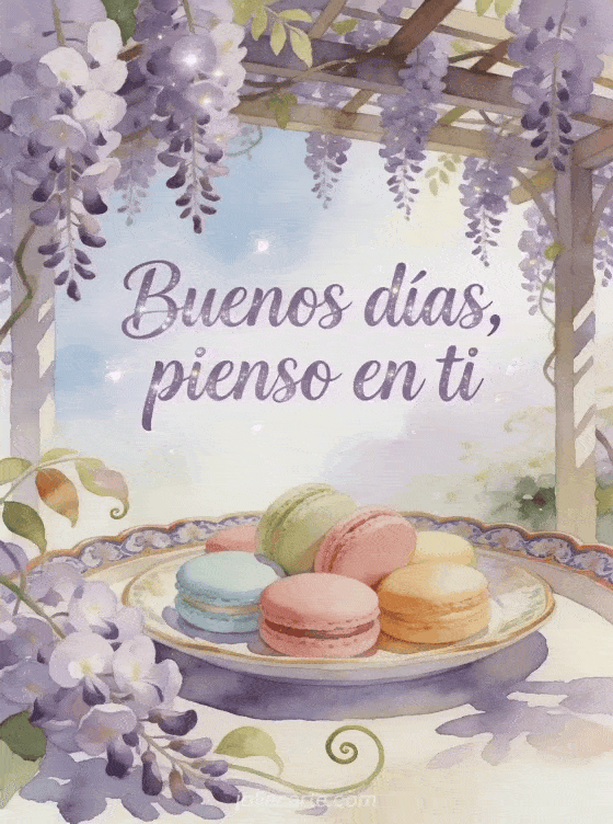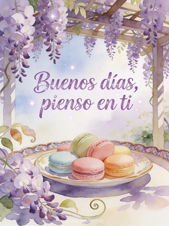 Envía una tarjeta amigable de buenos días con letras suaves lavanda en acuarela, una pérgola cubierta de glicina, una alegre bandeja de té y macarons pastel con luz de primavera. Descubre también una tarjeta floral de buenos días, una bonita tarjeta virtual gratis de buenos días o una tarjetas virtuales gratis de buenos días.