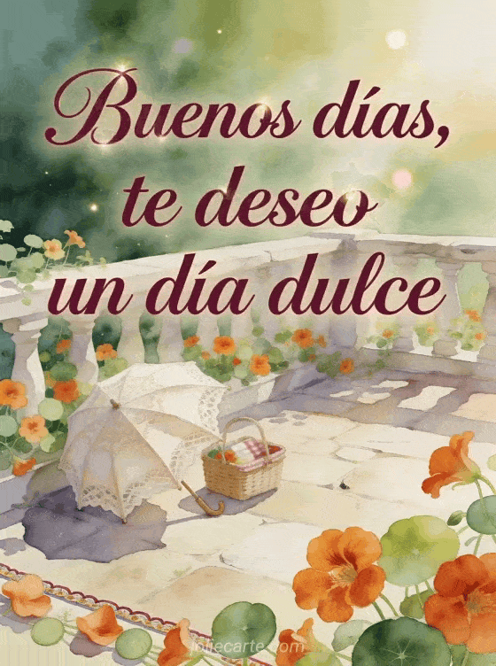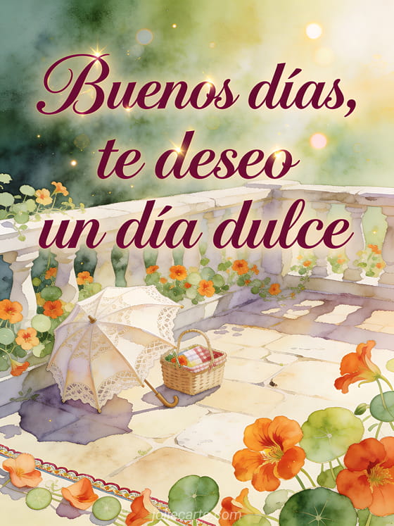 Envíe un mensaje de buenos días para una mujer con una escena refinada en acuarela sobre una terraza soleada, capuchinas, una sombrilla de encaje doblada y una pequeña cesta de picnic. Comparta este saludo delicado para desearle un día dulce, y descubran también un mensaje de buenos días para su hombre, un buenos días gracioso o un mensaje de buenos días conmovedor para mi esposa.