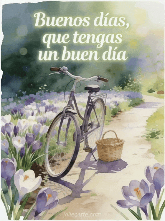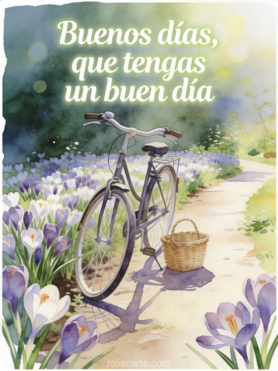 Envía una tarjeta alegre con una bicicleta vintage apoyada junto a un sendero de jardín lleno de crocus frescos y una pequeña cesta de mimbre. Descubran también un mensaje buenos días querida, unas tarjetas bonitas de buenos días o un mensaje de buenos días para su novia.
