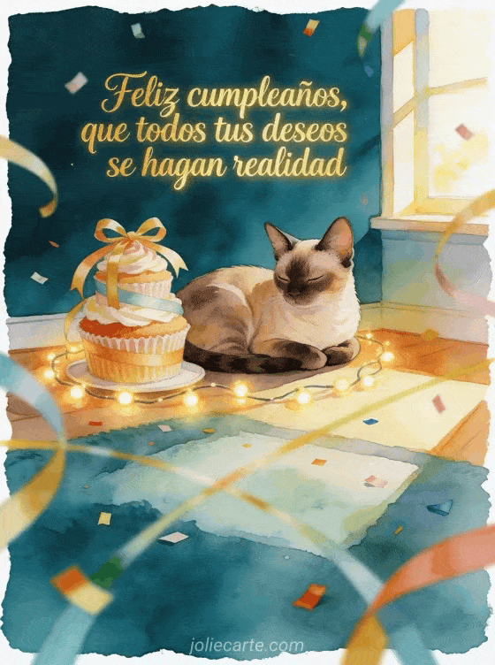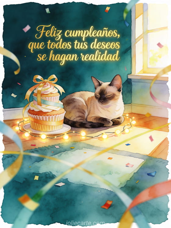 Comparte una tarjeta acogedora de cumpleaños en acuarela con un gato exotic shorthair acurrucado junto a una torre de cupcakes con lazos y guirnaldas luminosas en una habitación soleada, con confeti y serpentinas. Descubre también un cumpleaños de su hijo, un feliz cumpleaños mi hijo gifs o una tarjeta de cumpleaños gratis para mi hijo.