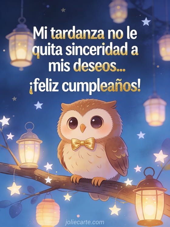 Comparte un cálido mensaje de cumpleaños tardío con alguien que aprecias. Descubre también una tarjeta cumpleaños atrasado humor o un gif feliz cumpleaños atrasado.