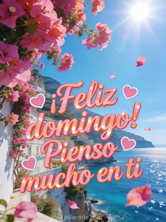 Envía un pensamiento cálido de feliz domingo con buganvillas luminosas en la costa amalfitana, muros blancos, cielo azul y mar brillante abajo. Descubran también una feliz domingo tarjeta gif, buen domingo por la mañana o feliz domingo mi amor.