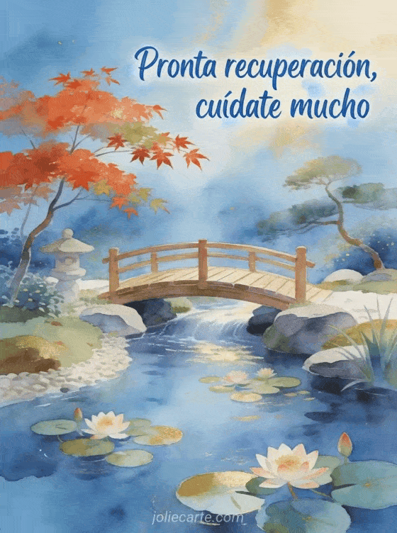Envia esta hermosa tarjeta de recuperacion con un jardin japones zen con un puente de madera y nenufares en flor para desear una pronta recuperacion. Descubre tambien una tarjeta de recuperacion mi amor o una tarjeta de sanacion con cita de amor o una tarjeta de pronta recuperacion.