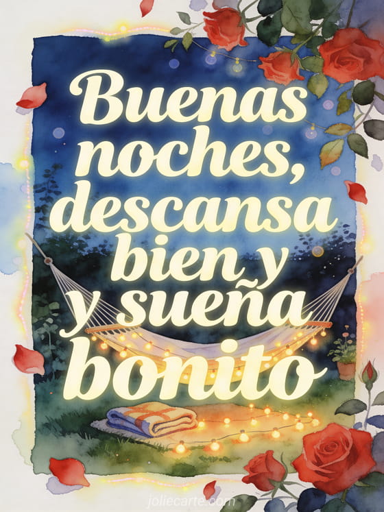 Envía un mensaje tierno de buenas noches con una hamaca en un jardín tranquilo, luces cálidas y pétalos de rosa en primer plano. Descubre también mensaje de buenas noches para su novia, precioso mensaje de buenas noches o mensaje de buenas noches para ella.