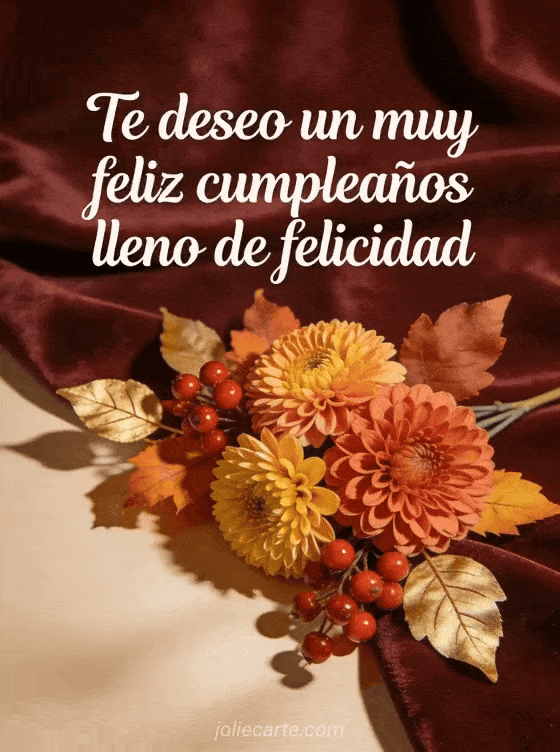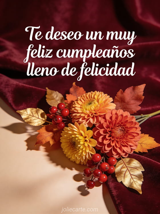 Envía esta preciosa tarjeta de mensaje de cumpleaños con caligrafía blanca sobre fondo burdeos aterciopelado, con flores de otoño, crisantemos, bayas rojas y hojas doradas en luz cálida. Una tarjeta fotorrealista perfecta para ella. Descubre también flores de cumpleaños para mujer o tarjeta bonita de cumpleaños para mujer gratis.