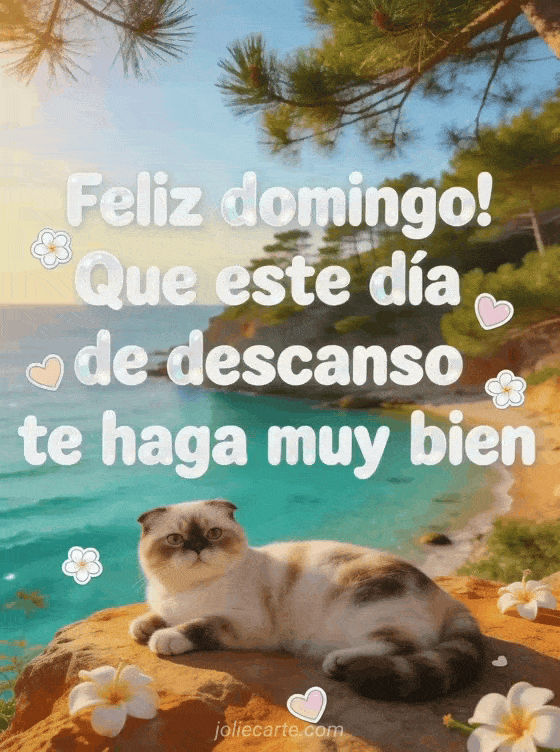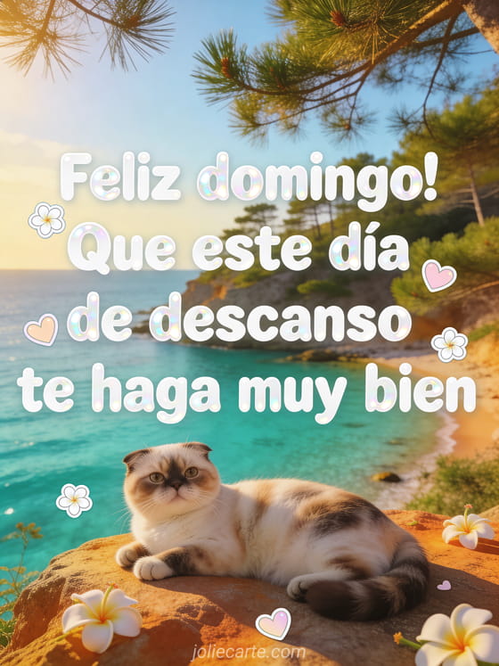 Envía un cálido mensaje de feliz domingo con letras blancas redondeadas, pequeñas flores, corazones pastel, una cala turquesa con pinos mediterráneos y un gato exotic shorthair descansando sobre una roca cálida. También pueden ver este feliz domingo gif animado, estas bonitas imágenes feliz domingo besos o esta tarjeta virtual hola feliz domingo.