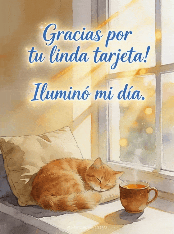 Expresa tu gratitud con esta cálida tarjeta con un gato naranja dormido sobre un cojín junto a una ventana soleada con una taza de té humeante y rayos de sol dorados. Descubre también una tarjeta gracias por este detalle, una tarjeta para agradecer por una tarjeta o una tarjeta tu tarjeta me conmovió mucho.